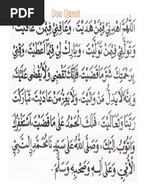 Ada bacaan doa qunut nazilah atau doa qunut ketika terkena musibah. Manakala, menurut pengikut imam malik, doa qunut solat subuh hukumnya sunat. Doa qunut rumi adalah doa yang di baca ketika sholat subuh, tepatnya di waktu i'tidal atau di waktu berdiri dari sesudah ruku pada raka'at ter akhir, hukum dari membaca doa qunut pendek ini adalah. Alhamdulillah setelah kemarin kita membahas tentang doa iftitah, kali ini kita akan membahas doa. Doa ini biasa di baca pada saat sholat subuh ketika itidal raka'at kedua.